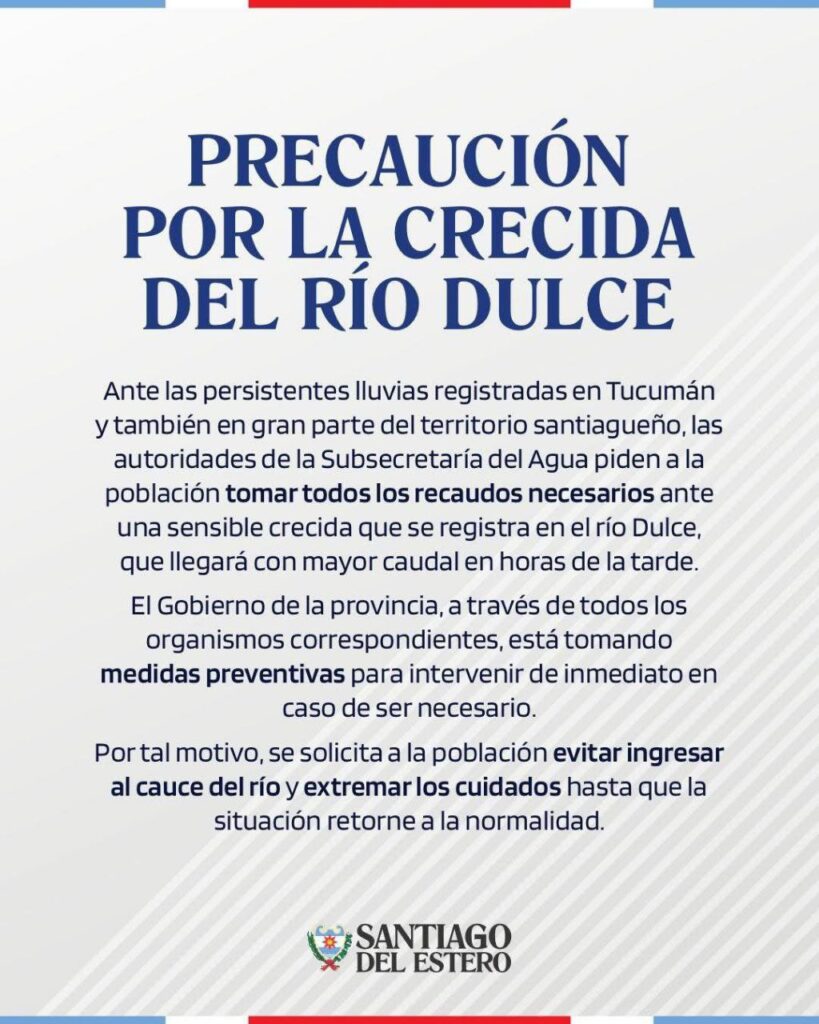 Ante las persistentes lluvias registradas en Tucumán y también en gran parte del territorio santiagueño, las autoridades de la Subsecretaría del Agua piden a la población tomar todos los recaudos necesarios ante una sensible crecida que se registra en el río Dulce, que llegará con mayor caudal en horas de la tarde.