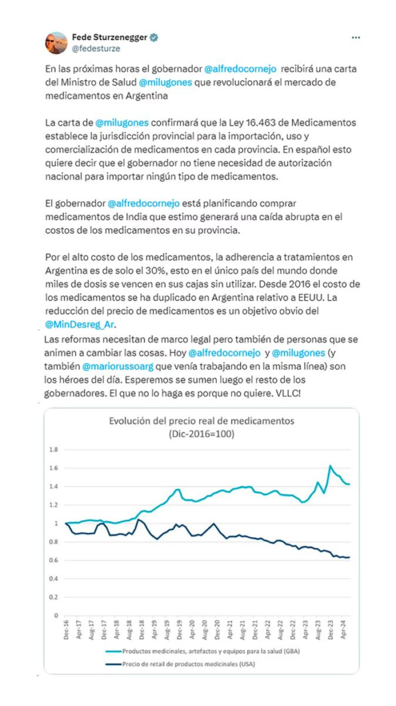 “En las próximas horas el gobernador Alfredo Cornejo recibirá una carta del ministro de Salud, Mario Lugones, que revolucionará el mercado de medicamentos en Argentina. La carta de Lugones confirmará que la Ley 16.463 de Medicamentos establece la jurisdicción provincial para la importación, uso y comercialización de medicamentos en cada provincia. En español esto quiere decir que el Gobernador no tiene necesidad de autorización nacional para importar ningún tipo de medicamentos”, dijo en su cuenta de X Sturzenegger.