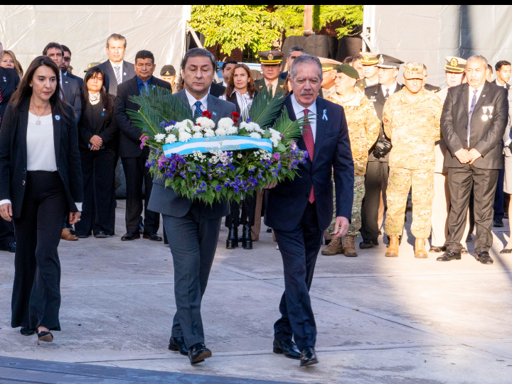 El gobernador Gerardo Zamora encabezó este miércoles el acto central por el Día del Veterano de Guerra y los Caídos en Malvinas, acompañado por el vicegobernador Carlos Silva Neder; el jefe de Gabinete, Elías Suárez, junto con representantes del Poder Judicial y miembros de las Fuerzas Armadas.