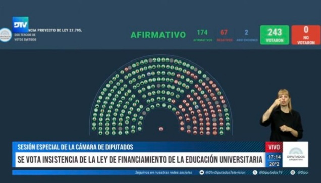 La Cámara de Diputados aprobó por 181 contra 60 votos el rechazo al veto a la ley de emergencia del hospital Garrahan, y por 174 contra 67 abstenciones la insistencia a la ley de financiamiento universitario.