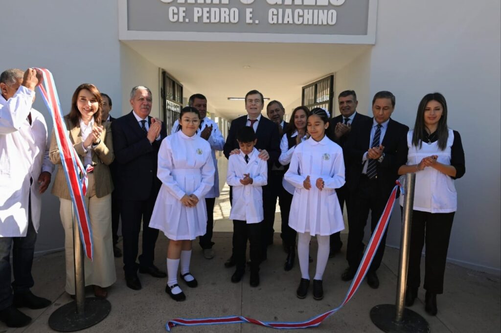 Luego se realizó la inauguración de las obras en la Escuela Nº 913 «Pedro Edgardo Giachino», donde las autoridades fueron recibidas por el director Oscar Sayago, quien los acompañó en el recorrido por las instalaciones del edificio que cuenta con dirección, secretaria, sala de música, laboratorio, biblioteca, sala de informática, internet, baños, salón de uso múltiples, espacio nucleado, jardinería, sección deporte y comedor para un total de 884 alumnos en los turnos mañana y tarde.